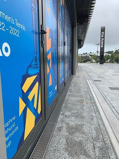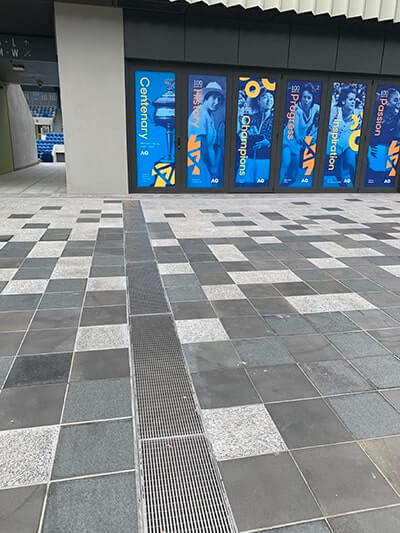 Heelguard supplied drainage systems to almost every part of this stage 3 development. A major focus being on full perimeter drainage using Click Drain 200 Series for the new Kia Arena, zero threshold trench grates to all concession doors and public entries, trench grates to the open air terrace at Centrepiece and to pedestrian access ramps. Ideal Drain and Flexi Drain were also installed.
